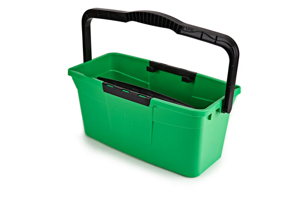 Zu den unverzichtbaren Zubehörprodukten für die Arbeit von Profi Glas- und Fensterreinigern gehört unbedingt ein UNGER Eimer. Die Neuauflage unseres klassisch rechteckigen Eimers punktet mit vielen praktischen Details, die den Arbeitsalltag mehr als erleichtern. Das Fassungsvermögen des Eimers beträgt 12 l und seine schmale und kompakte Form bietet ausreichend Platz für wichtige Utensilien. Zwei Ablagen dienen zusätzlich dazu, Einwascher und Fensterwischer sicher aus der Hand zu legen. Überzeugend ist vor allem der neue ergonomische Griff mit vertikaler Fixierung. Er ist handlich und überzeugt vor allem dadurch, dass er sich clever fixieren lässt und nicht ungewollt einklappt.