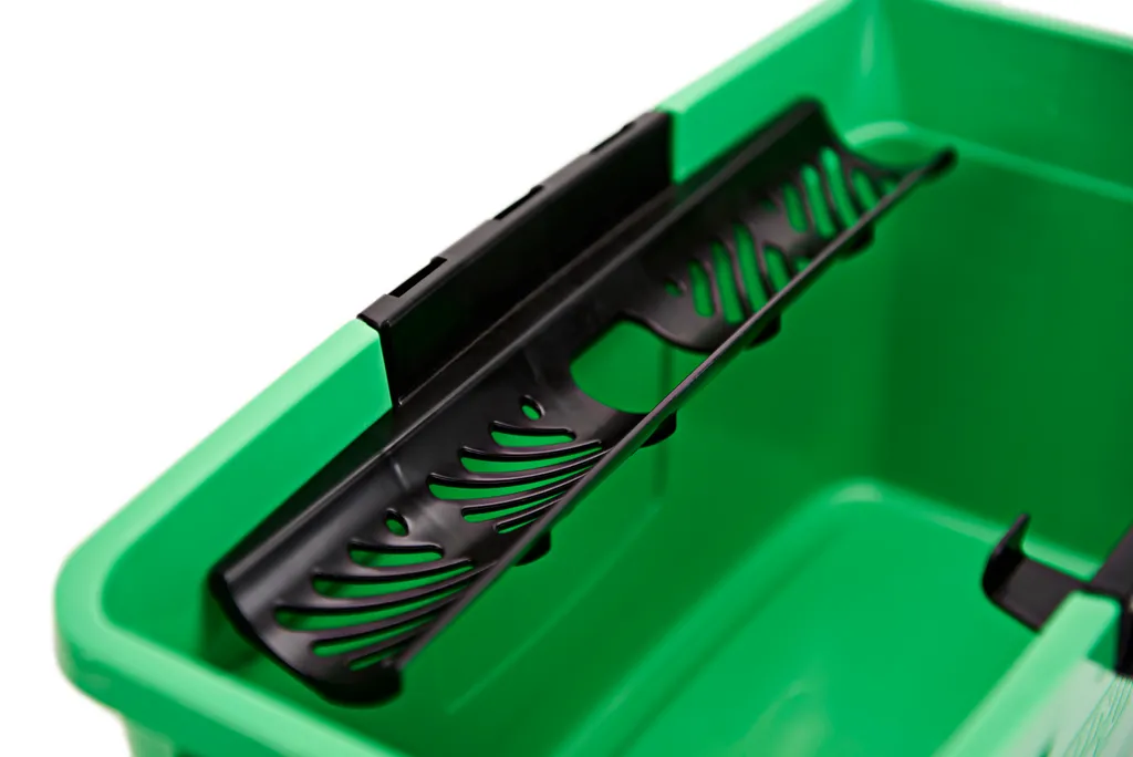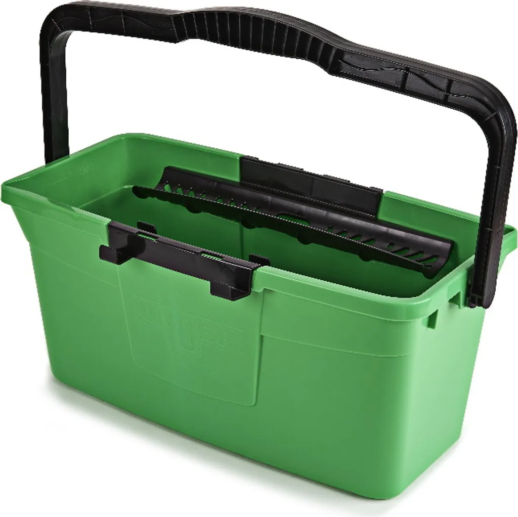 Als Must-have für jeden professionellen Glas-und Fensterreiniger dient der UNGER Eimer auch dazu, wertvolles Arbeitsequipment sicher zu transportieren. Aus diesem Grund haben wir die Neuauflage unseres klassisch rechteckigen Eimers um viele praktische Details erweitert, die den Arbeitsalltag mehr als erleichtern werden. Das Fassungsvermögen des Eimers beträgt 12 l und seine schmale und kompakte Form bietet ausreichend Platz für wichtige Utensilien. Zwei Ablagen dienen zusätzlich dazu, Einwascher und Fensterwischer sicher aus der Hand zu legen. Überzeugend ist vor allem der neue, ergonomische Griff. Er ist handlich und überzeugt insbesondere dadurch, dass er sich clever fixieren lässt und nicht ungewollt einklappt – das ist einzigartig am Markt. Für Profis nicht unwichtig: Unser Eimer ist durch seine markant grün-schwarze Farbgebung schon von Weitem als hochwertiges UNGER Markenprodukt erkennbar.