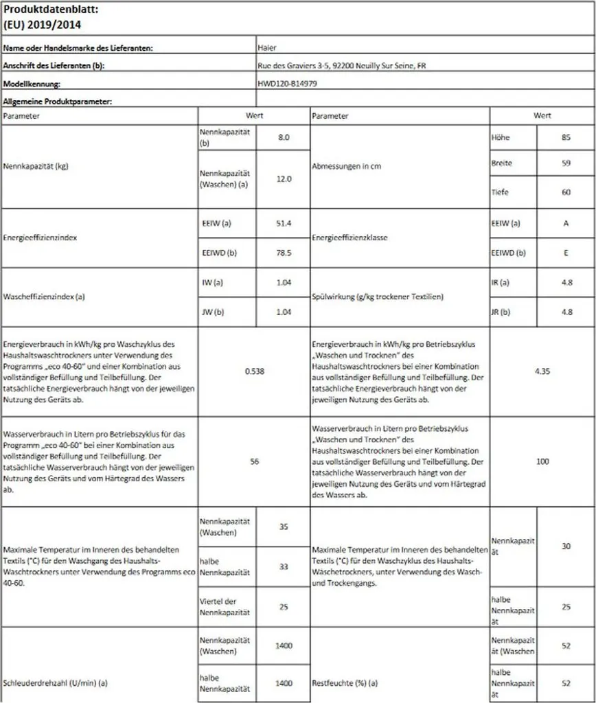 - Effizienzklassen für den Wasch-Trocknen-Zyklus (links): E