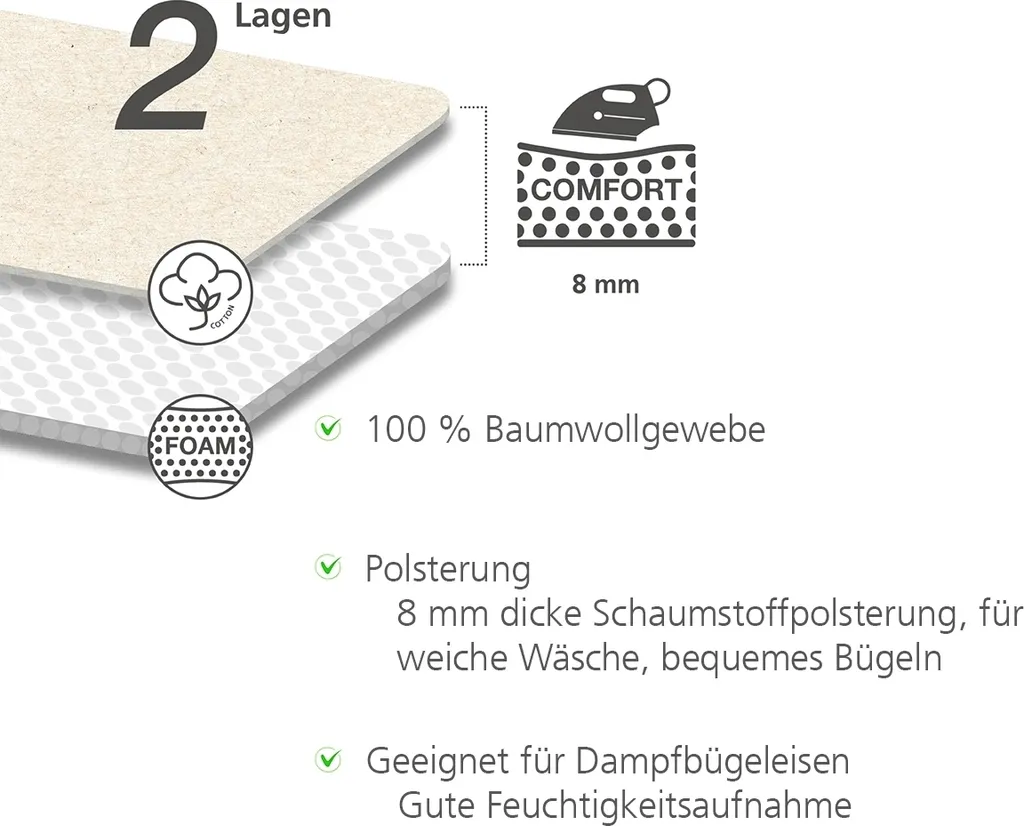 Der Bezug des Bügeltisches verfügt über eine 2-Lagen-Polsterung aus Baumwollstoff (8mm). Diese sorgt nicht nur für angenehmes Bügeln, sondern schont auch ihre Lieblingskleidungsstücke. Durch die intakte Polsterung ist das Brett auch dampfbügelgeeignet, da es Feuchtigkeit ohne Probleme aufnehmen kann.