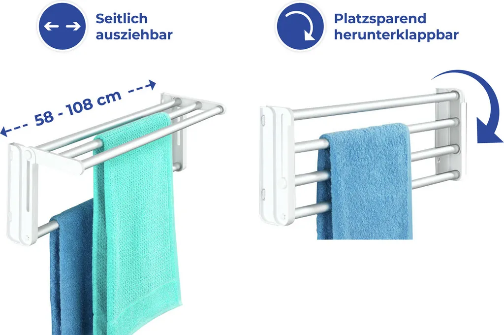 - Bietet ausreichend Platz zum Trocknen von Handtüchern, kleineren Wäschestücken, etc. Maximale Trockenlänge: ca. 4,15 m.