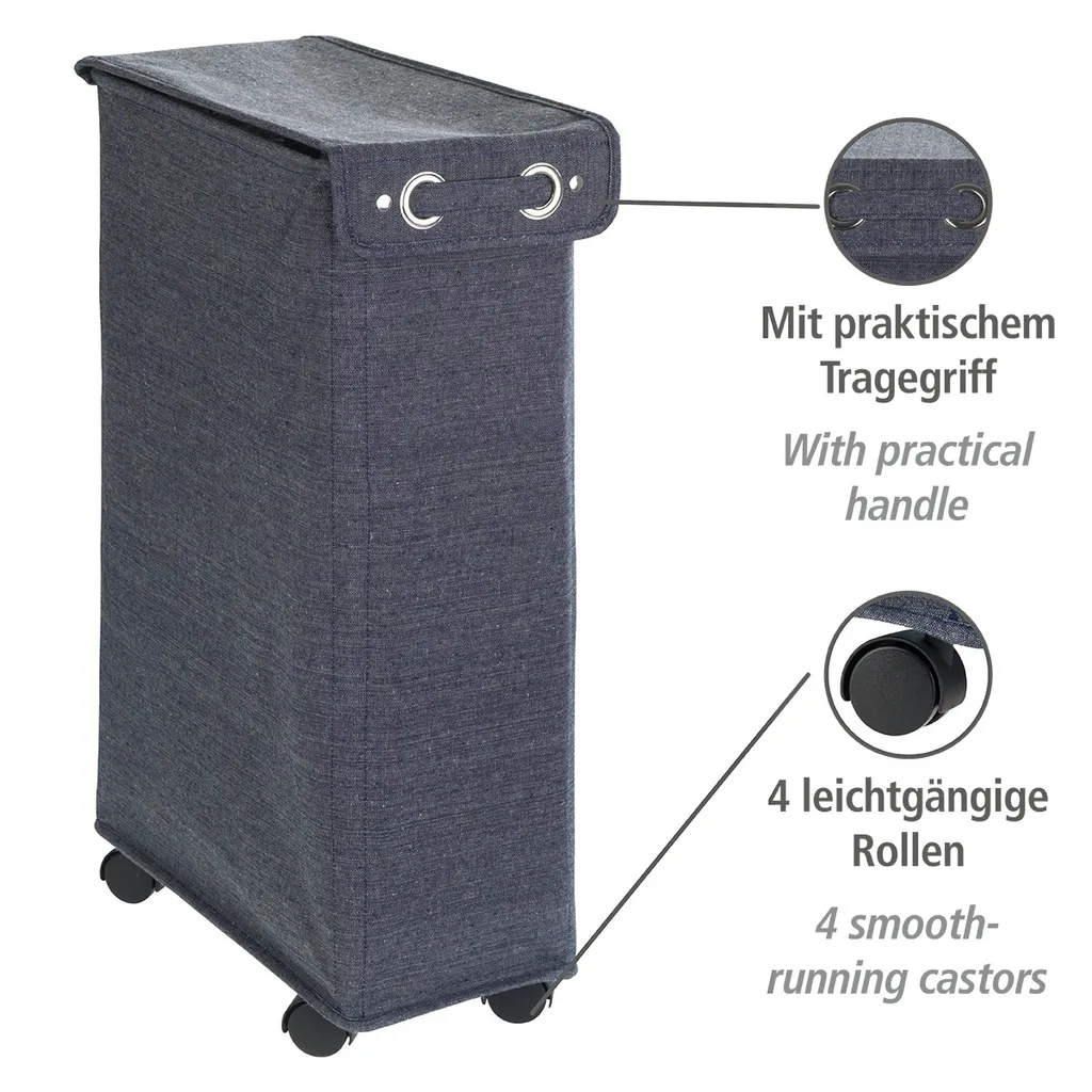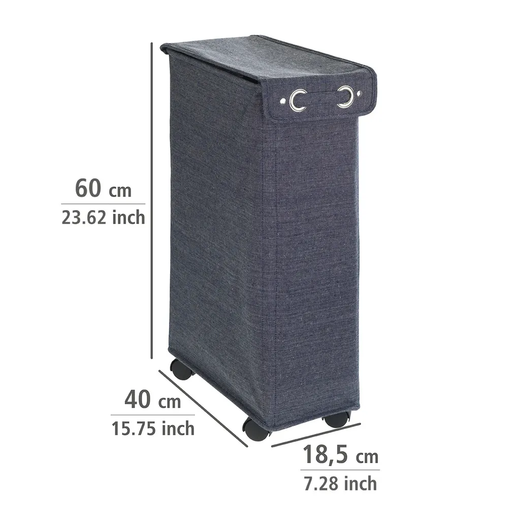 - Lieferumfang: 1x Wäschesammler Corno Prime Blau, Wäschetruhe von WENKO, Fassungsvermögen 43 Liter, (B x H x T): 18,5 x 60 x 40 cm, Wäschesammler: 50 % Polyester, 50 % Baumwolle / Rollen: Polypropylen.